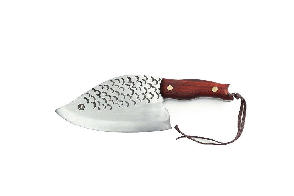 Esta faca de açougueiro artesanal ganhou recentemente enorme popularidade entre cozinheiros profissionais, bem como entre cozinheiros de casa. Ela captura corações não apenas com o design divertido da lâmina estilo peixe, mas também com a capacidade de fatiar tudo sem esforço.
